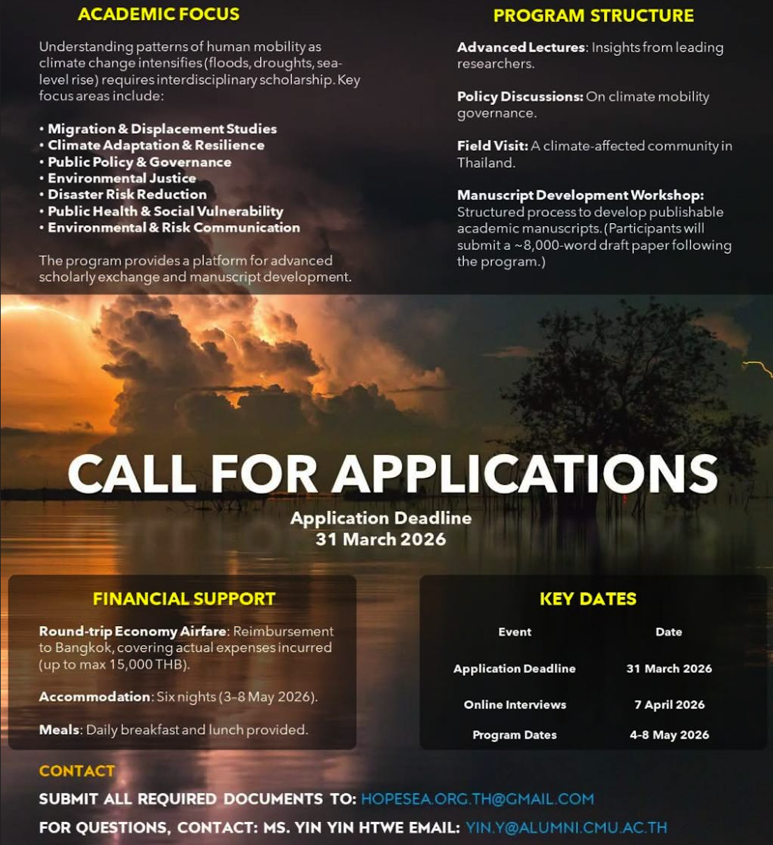 The Humanitarian Observatory for Policy and Education in Southeast Asia (HOPESEA), School of Public Policy at Chiang Mai University (CMU), Asian Institute of Technology (AIT) and Faculty of Journalism and Mass Communication, Thammasat University (JCTU) invite applications for a highly selective Global Summer School on Climate Change and Human Mobility